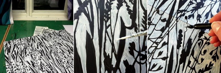 Kuosisuunnitteluni lähtökohtana on käsin tehty luonnos. Tässä esimerkkinä heinä-kuosi, joka on käsin maalattuna ja piirrettynä half-drop-raportissa. Paperi on halkaistu raportin vuoksi neljään osaan ja teippiä kuluu kun osien paikkoja työn edetessä vaihtelee. Kuosi on pintamainen eli olen tavoitellut tasaista sommittelua. Valkoiset tyhjät aukot on täytettävä jos sellaisia maalatessa jää.